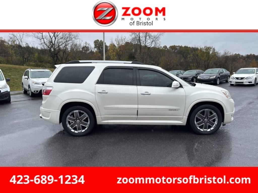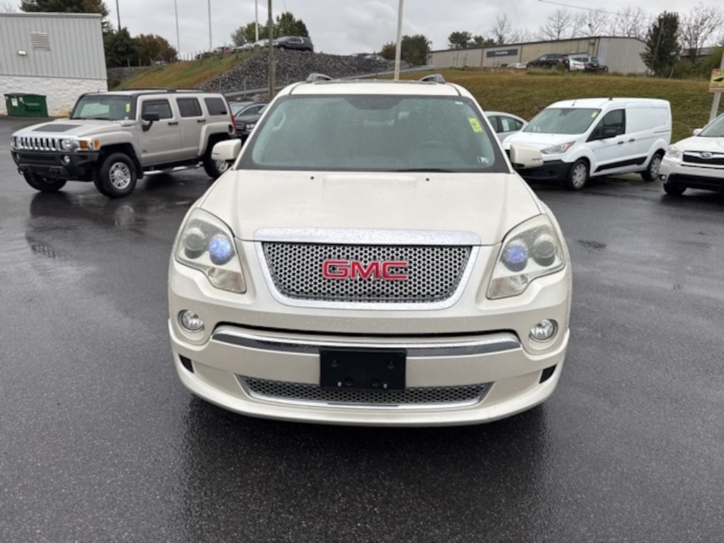 White Diamond Tricoat 2012 GMC Acadia Denali AWD 6-Speed Automatic Electronic with Overdrive 3.6L V6 SIDI Safety Package, Leather, AWD, Ebony Leather, 2-Position Memory For Driver's Seat Adjuster, 4-Way Power Passenger Seat, 5-Gauge Instrumentation, 7-Passenger Seating (2-2-3 Seating Configuration), 8-Way Power Driver Seat, Bluetooth® For Phone, Body-Color Moldings w/Chrome Insert, Denali Specific Acoustic Insulation Package, Denali Specific Body-Color Rocker Molding, Denali Specific Double Dual Exhaust w/Chrome Tips, Denali Specific Front & Rear Body-Color Fascias, Denali Specific Illuminated Sill Plate, Digital Compass Display, Dual SkyScape 2-Panel Power Sunroof, Front & Rear Body-Color Wheel Flares, Head-Up Display, Heated & Cooled Front Seats, Heated Power-Adjustable Outside Mirrors, Heavy-Duty Cooling System, High-Intensity Discharge Projector Low Beam Headlamps, Inside Rear-View Auto-Dimming Mirror, Integral Spotter Blind-Zone Mirrors, Leather-Wrapped Steering Wheel w/Wood Trim, Power Rear Liftgate Body, Power Windows w/Driver Express-Up & -Down, Preferred Equipment Group 5SA, Premium Carpeted Front 2nd & 3rd Row Floor Mats, Rear Audio System Controls, Rear Cargo Area Audio System Controls, Rear Park Assist, Rear Vision Camera, Remote Vehicle Start, Technology Package, Trailer Hitch, Trailering Equipment, Tri-Zone Automatic Climate Control, Universal Home Remote, Variable Effort Power Steering.
