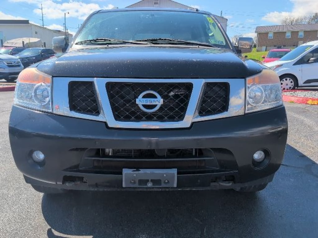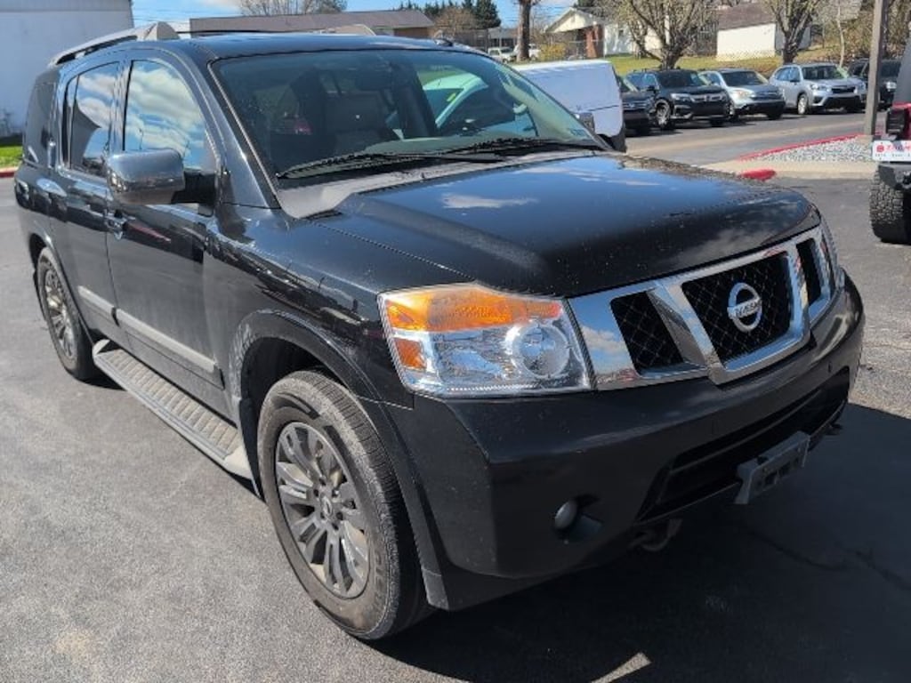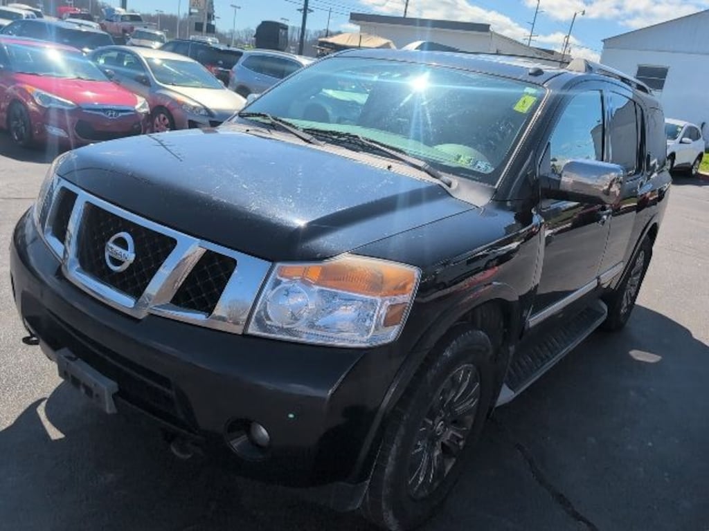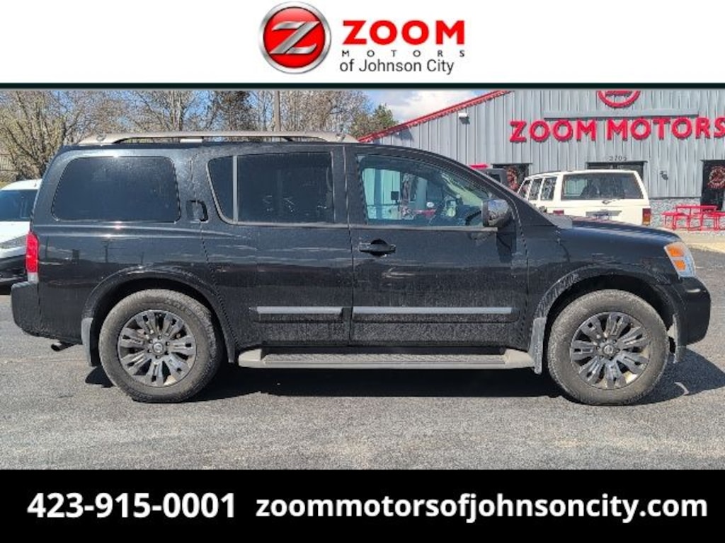 Magnetic Black 2015 Nissan Armada Platinum 4WD 5-Speed Automatic with Overdrive 5.6L 8-Cylinder SMPI DOHC Safety Package, Leather, Sunroof, Navigation System, Keyless Entry, Alloy Wheels, Bluetooth, CLEAN CARFAX, Heated Front Seats, Heated Rear Seats, Memory Seat, Power Seats, Cruise Control, Brake Assist, Power Liftgate, 4WD, 4WD, 20" Dark Chrome Wheels, Body-Colored Exterior Door Handles, Center Console w/Cupholder Lid, Chocolate Embroidered Floor Mats, Chocolate Leather Steering Wheel, Dark Chrome Body-Side Molding Insert, Dark Chrome Grille, Dark Chrome Outside Mirrors, Dark Chrome Roof Rack Ends, Dark Chrome Wheel Caps, Light Aniegre Genuine Wood Trim, Platinum Reserve Package, Premium Grade Leather Seat Trim, Reserve Exterior Tailgate Badge.